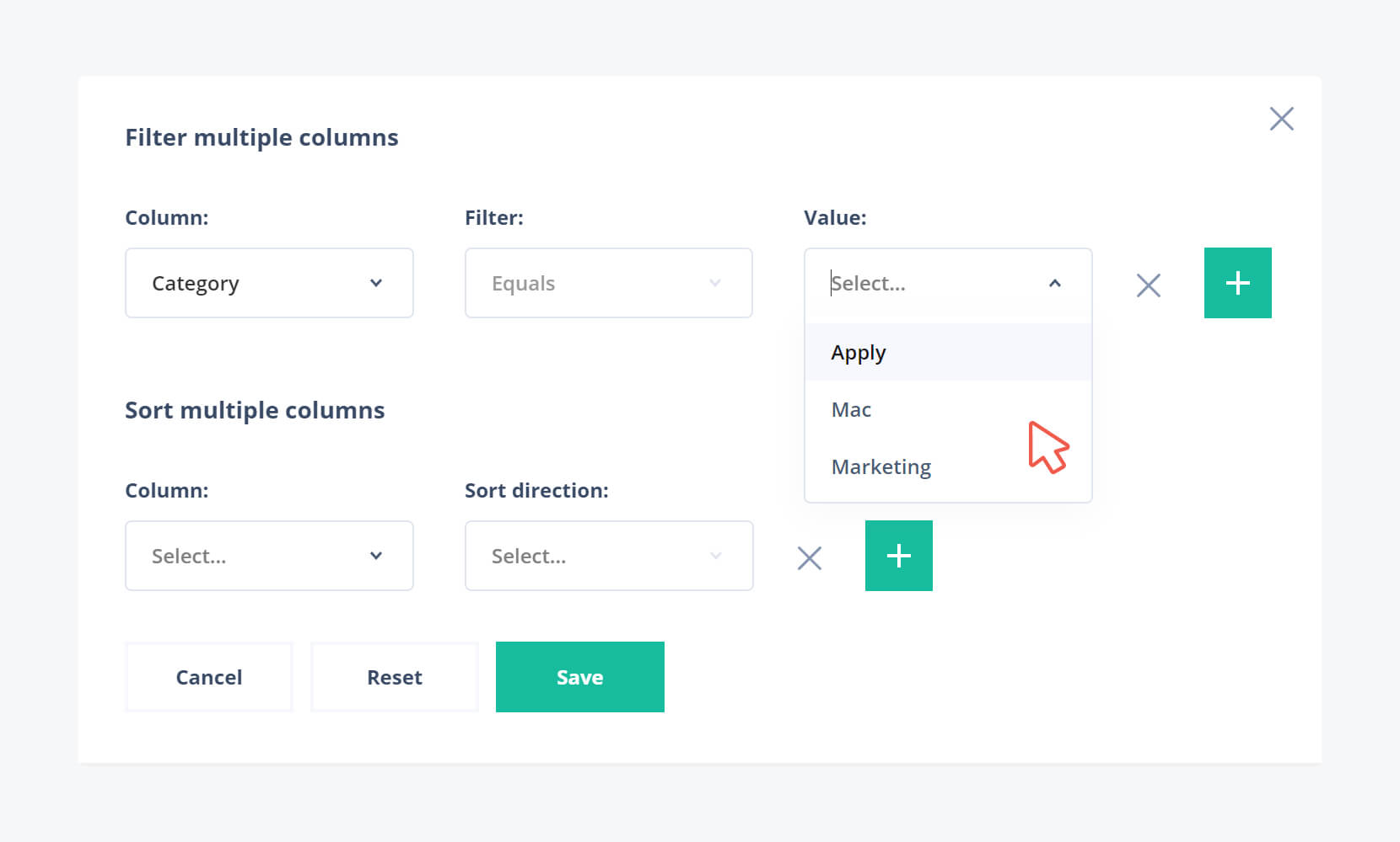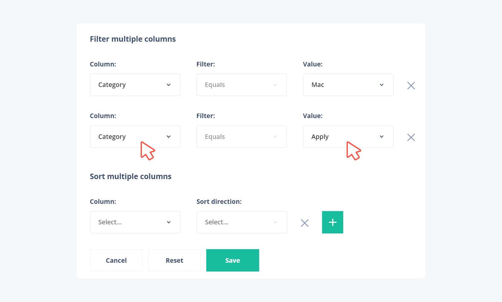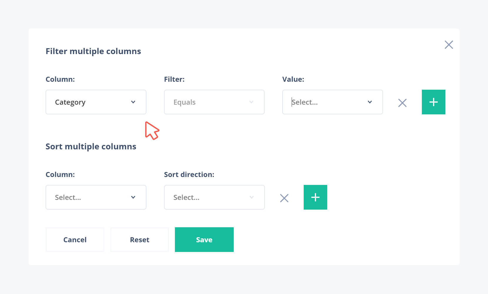 To filter by multiple categories, click the "+" button next to the filtered category.