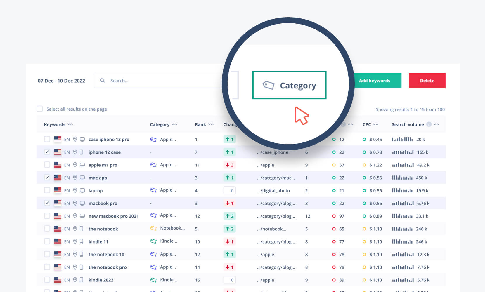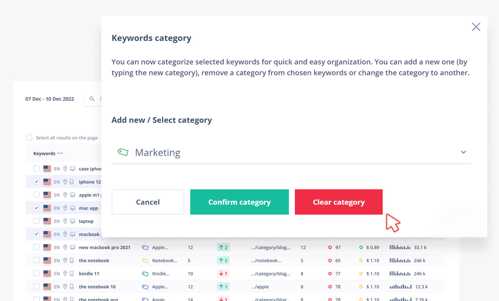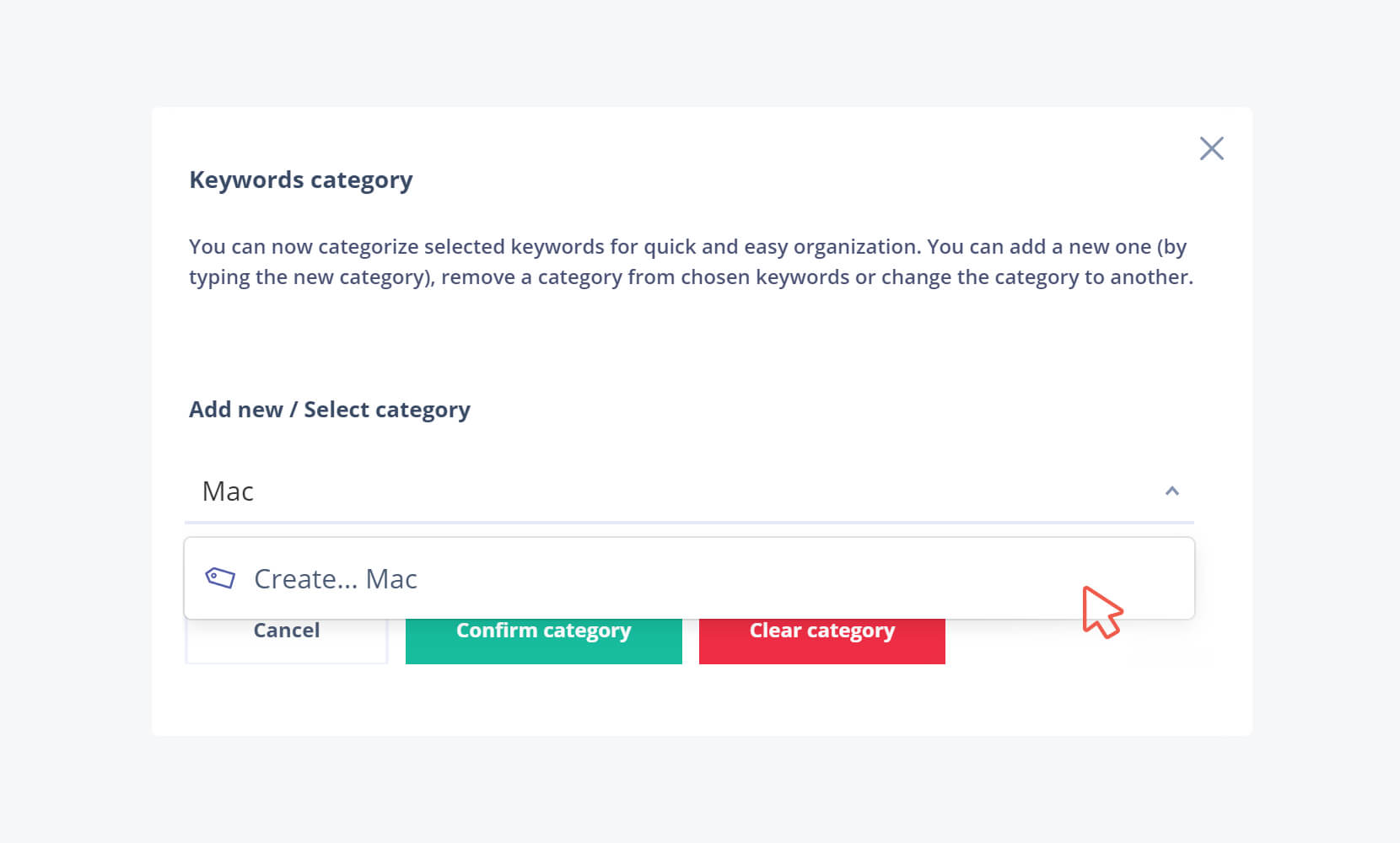 To add a category to the keywords, first, select those keywords, and next, click the category button.